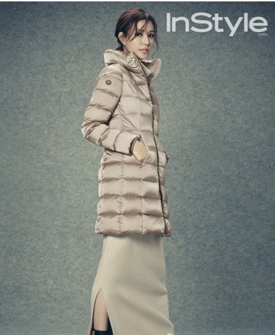 화보 속 손태영은 연한 브란운 컬러의 패딩에 롱스커트를 걸치고 있다.