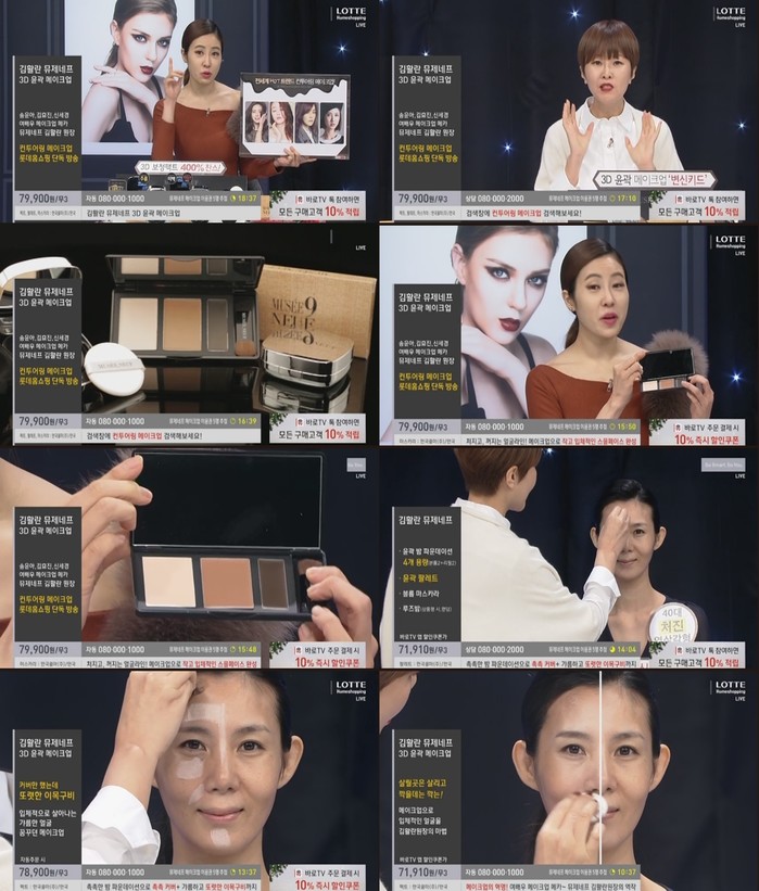 이날 쇼호스트는 "요즘 메이크업의 이슈를 점령하고 있는 키워드는 '컨투어링 메이크업'이다,김활란 원장님이 담당하고 있는 송유나,김효진,신세경,이수경 등 우리가 많이 알고 있는 투명메이크업의 대표주자들도 사실 깎을 곳은 깎고 음영을 넣어서 표현한다"고 제품에 대해 소개했다.