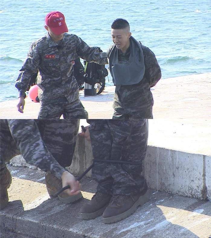 그러나 훈련은 입영만으로 끝나지 않았다. 갑자기 끈을 들고 등장한 교관은 ‘포박 수영 훈련’을 예고하며 손과 발을 묶고 바다 수영하는 시범을 보였다. 보는 것만으로도 아찔한 상황에 멤버들 모두 경악을 금치 못했다.