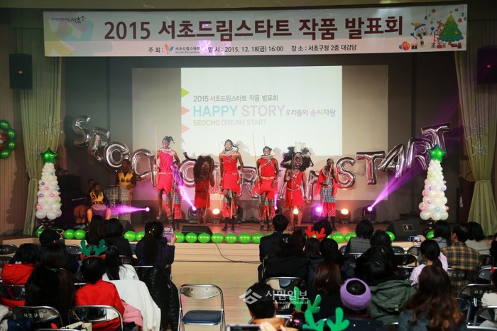 서초구는 최근 구청 대강당에서 드림스타트 후원자 및 대상아동과 가족 등이 참석한 가운데 '2015 서초드림스타트 작품 발표회'를 개최했다. 사진은 탄자니아와 케냐 출신의 '아프리카 민속 찬양단'이 공연을 하는 모습.(사진제공=서초구청)