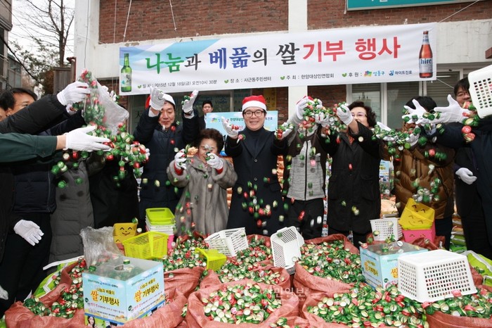 서울 성동구는 최근 사근동 주민센터 앞에서 병뚜껑 22만개를 쌀로 교환해 저소득층을 지원하는 '나눔과 베풂의 쌀 전달식'을 열었다. 사진은 정원오 구청장(가운데)과 관계자들이 병뚜껑을 떨어뜨리는 퍼포먼스를 하는 모습.(사진제공=성동구청)