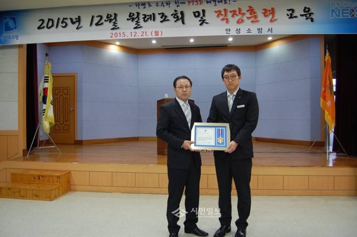 경기 안성소방서는 21일 대회의실에서 '2015년 하반기 BEST-안성소방인'으로 장비팀 소방교 김남익 대원을 선정해 표창장 수여식을 진행했다. 사진은 권은택 서장과 김남익 대원이 기념촬영을 하는 모습.(사진제공=안성소방서)