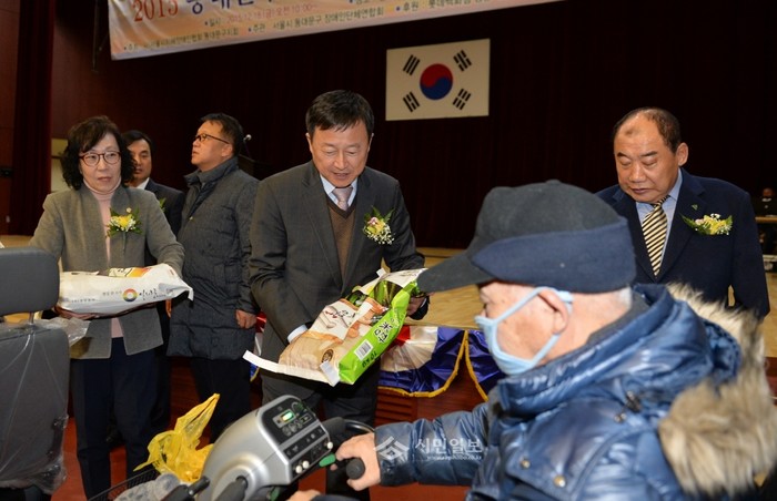 서울 동대문구 강병호 부구청장(가운데)이 지난 18일 동대문구청에서 열린 '동대문구 장애인재활증진대회' 행사에서 참여 주민에게 사랑의 쌀을 전달하고 있다.(사진제공=동대문구청)