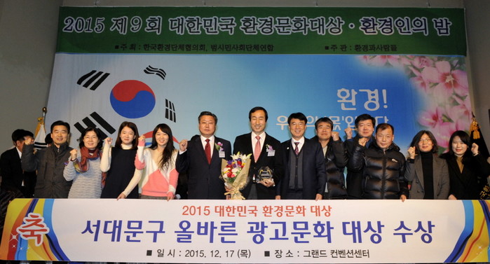 최근 서울 당산동 그랜드컨벤션센터에서 열린 '2015 대한민국 환경문화대상' 시상식에서 ‘올바른 광고문화대상’을 받은 문석진 서대문구청장(가운데)이 구청 관계 직원들과 파이팅을 외치고 있다.