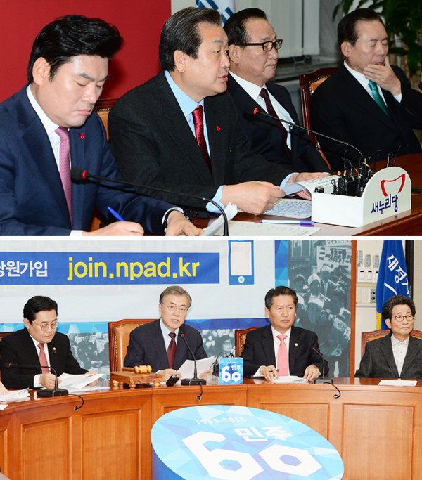 21일 오전 서울 여의도 국회에서 열린 새누리당 최고위원회의에서 김무성 대표가 모두발언을 하고 있다(위). 문재인 새정치민주연합 대표가 21일 오전 서울 여의도 국회에서 열린 최고위원회의에서 모두발언 하고 있다. 이날 최고위원회의에는 새로 임명된 이목희(오른쪽) 정책위의장이 참석했다.