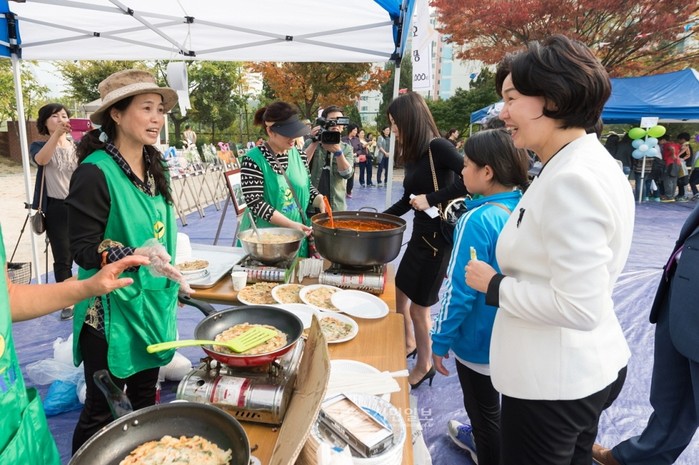 | ▲ 은정초등학교에서 열린 마을거버넌스 나눔한마당에 참석한 김수영 구청장(오른쪽)이 먹거리를 판매하고 있는 주민들과 이야기를 나누고 있다. | ||