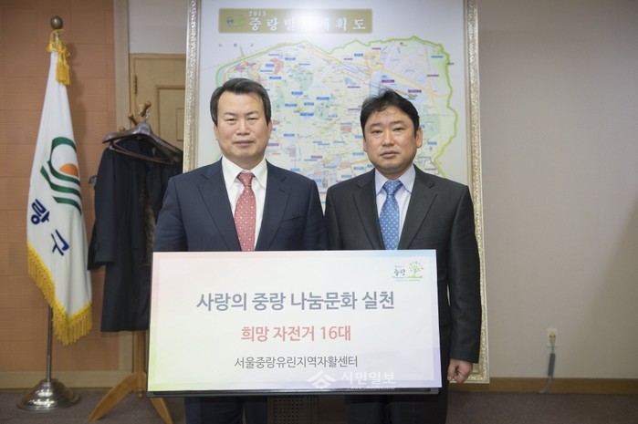 서울 중랑구는 지난 21일 오후 구청에서 취약계층 재생자전거 전달식을 진행했다. 사진은 나진구 구청장(왼쪽)이 서울중랑유린지역자활센터 한인규 센터장으로부터 재생자전거 16대를 전달 받고 기념촬영을 하는 모습.(사진제공=중랑구청)
