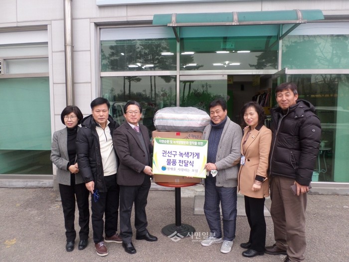경기 수원시 '형제를 사랑하는 모임'에서는 최근 권선구 새마을부녀회에 녹색가게 기증물품 의류 80여점을 전달했다. 사진은 전달식에 참석한 관계자들이 기념촬영을 하는 모습.(사진제공=권선구청)