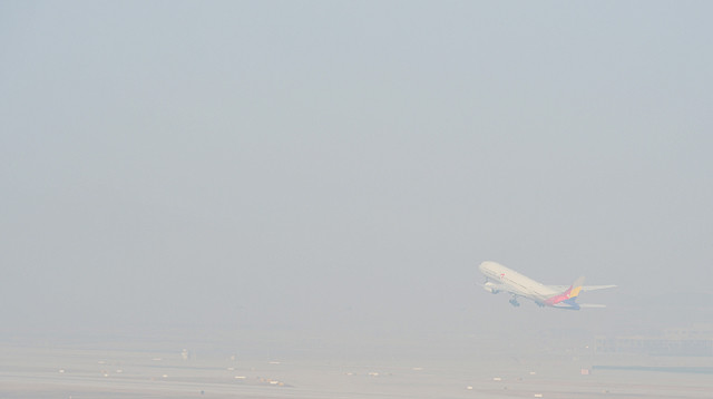 환경부가 23일까지는 전국적으로 대기 질이 상당히 좋지 않을 것으로 관측했다. 이는 국내 발생 미세먼지와 중국발 미세먼지가 합쳐졌기 때문인데, 중국은 나흘째 대기오염 최고등급인 적색경보가 발령중이다. 22일 오후 인천국제공항 활주로에서 여객기가 미세먼지를 뚫고 이륙하고 있다.
