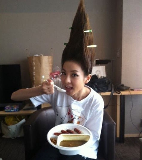 산다라박은 공개된 사진 속에서 머리를 위로 치켜올린 체 음식을 먹는 포즈를 취하고 있다. 산다라박의 장난스러운 매력이 돋보이는 순간이다.
