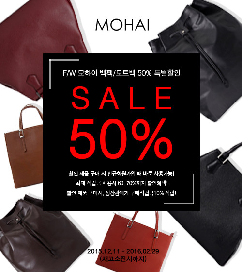 모하이는 이번 특별 할인 이벤트를 통해 2015/16 FW시즌 제품을 무려 50% 할인된 가격에 판매한다. 우선 모하이 백팩과 토트팩 50% 할인을 시작으로, 매주 할인제품을 추가로 업데이트할 예정이다. 또 신규가입 회원에게는 할인 이벤트 제품에도 사용할 수 있는 최대 23,000원의 적립금을 제공한다.