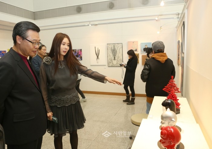 성장현 서울 용산구청장이 지난 22일 용산아트홀 전시실에서 열린 '사랑해요 용산' 사랑의 바자전 행사에 참석해 관계자의 설명을 듣고 있다. 이날 행사는 용산미술협회 주최, 용산구청 후원으로 열렸다.(사진제공=용산구청)