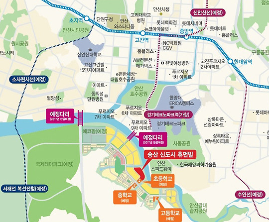 또한, 2017년 안산시 연결다리 개통시 10분 이내에 고잔신도시에 도달할 수 있으며, 2017년 77번국도 확장 개통시 반월지구, 고잔, 중앙역이 10분 이내에 접근이 가능하다. 또한, 2016년 예정인 소사-원시선 원시역과 2017년 예정인 수인선 사리역, 2020년 예정인 서해복선전철 송산역이 개통되면 교통환경은 한층 더 좋아질 전망이다.
