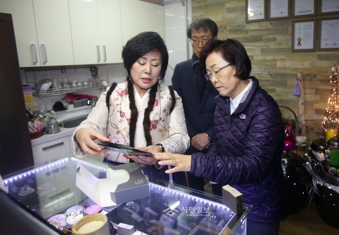 최근 실시된 세계적인 불황 속에 어려움을 겪고 있는 지역내 유망 기업과 함께하는 현장 간담회에 참석한 신연희 강남구청장(오른쪽)이 한 중소기업을 방문해 최고경영자(왼쪽)로부터 어려움과 건의사항을 듣고 있다.(사진제공=강남구청)