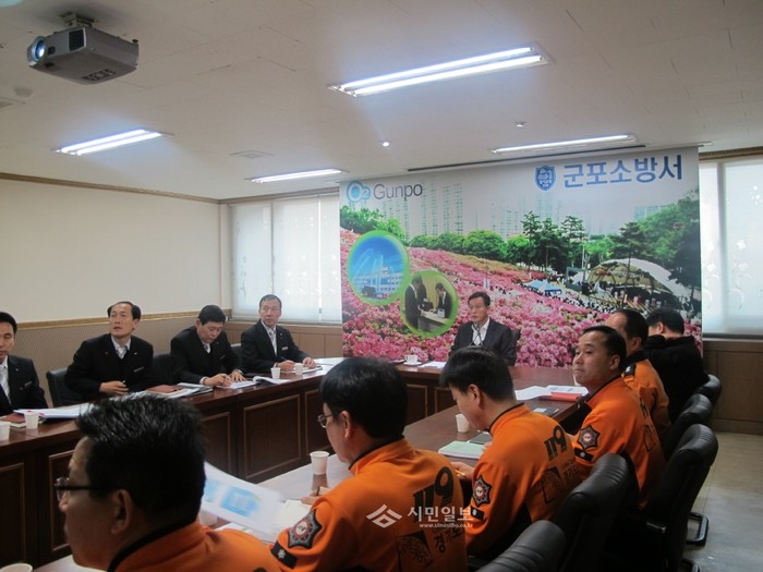 경기 군포소방서는 지난 24일 소회의실에서 ‘2015년도 업무성과 보고회’를 진행했다. 사진은 보고회에 참석한 조창래 서장을 비롯한 소방서 관계자들이 회의를 하는 모습.(사진제공=군포소방서)