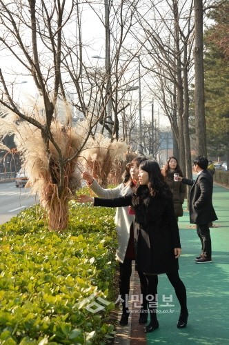 지난 23일 점심시간 서울 양천구 신정동 양천공원으로 산책을 나온 직장인들이 가로수에 설치된 나무덮개 조형물을 보고 신기한 듯 구경하고 있다.(사진제공=양천구청)