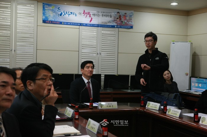 이해식 서울 강동구청장은 최근 구청 재난상황실에서 멧돼지 출몰에 따른 주민안전대책을 마련하기 위해 한상훈 환경부 박사, 이성민 서울대 산림과학부 연구원 등과 대비방안을 논의했다. 사진은 이 구청장이 설명을 듣는 모습.(사진제공=강동구청)