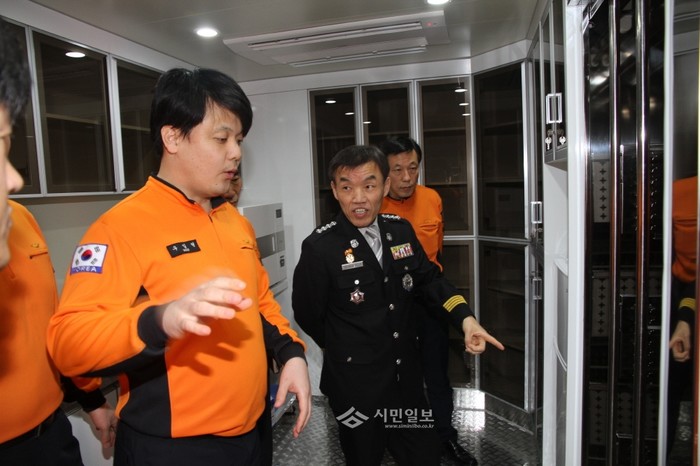 서울 관악소방서는 최근 세균성 감염물질에 의한 감염 및 신종 감염병 예방을 위해 구급장비를 소독하기 위한 감염관리실을 설치했다. 사진은 감염관리실을 방문한 황인환 서장이 구급대원에게 설명을 듣고 있는 모습.(사진제공=관악소방서)