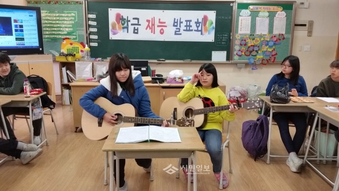 경기 부천 성곡초등학교는 최근 성장한 자신의 모습과 재능을 발표하는 '재능 발표회'를 학급별로 실시했다. 사진은 발표회에 참석한 학생들이 기타공연을 하는 모습.(사진제공=부천교육지원청)
