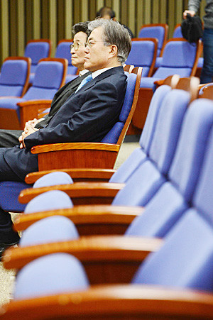 새정치민주연합 문재인 대표가 28일 서울 여의도 국회에서 열린 의원총회에서 이종걸 원내대표의 모두발언을 듣고 있다.