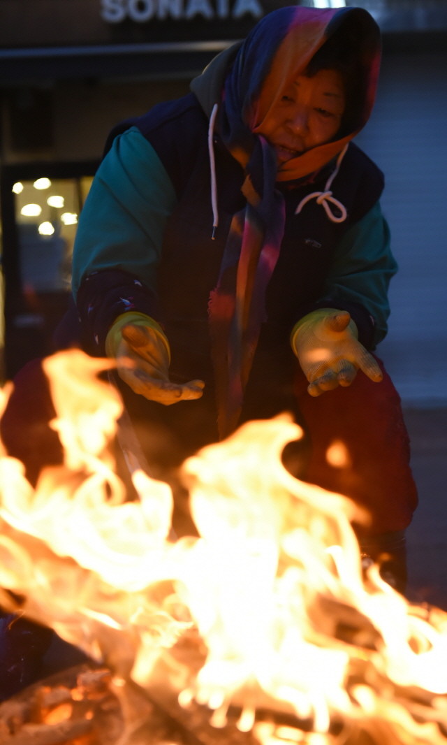 아침 서울 기온이 -9도를 기록해 한파가 절정을 이루는 28일 오전 서울 중구 중림동 도깨비 어시장에서 상인이 모닥불을 쬐고 있다.
