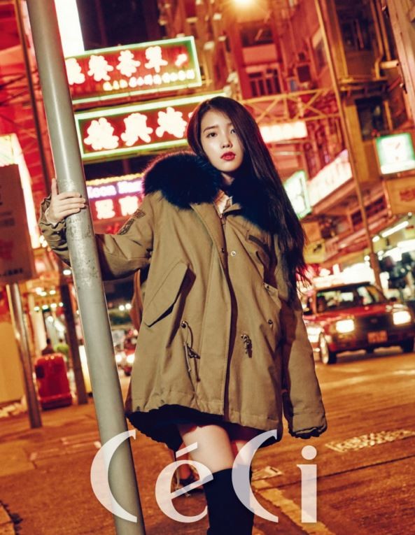 공개된 화보 속 아이유는 겨울 아이템의 필수 아이템인 안단과 후드에 풍성한 털이 달린 야상점퍼를 착용하고 있다. 특히 야상점퍼의 짙은 블루색의 퍼가 인상적이다.