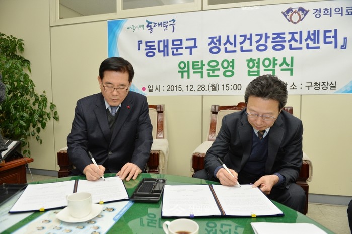 서울 동대문구는 최근 구청장실에서 경희의료원과 정신건강증진센터 위탁운영 협약식을 진행했다. 사진은 협약식에 참석한 유덕열 구청장(왼쪽)과 김건식 경희대학교 병원장이 협약서에 서명을 하는 모습.(사진제공=동대문구청)