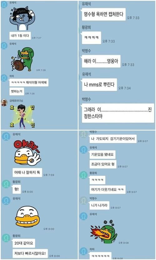 공개된 대화 내용 속 유재석은 깜찍한 이모티콘과 함께 "내가 1등이다"라고 등장했다. 그러자 하하가 "ㅋㅋㅋㅋㅋ 재석이 형 어색해 채팅하는 거"라고 말했다.