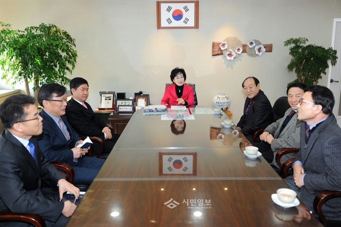 송파구는 최근 구청장실에서 '전통시장 연합회 상인회장 간담회'를 진행했다. 사진은 간담회에 참석한 박춘희 구청장이 관계자들과 '2016년 전통시장 및 상점가 지원사업'에 대해 논의하는 모습.(사진제공=송파구청)
