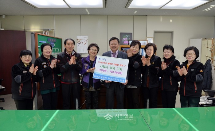동대문구청에서 청소를 담당하고 있는 15명의 직원이 지난달 29일 오후 강병호 부구청장(가운데)을 만나 지난 1년간 모은 성금 70만원을 전달했다.(사진제공=동대문구청)