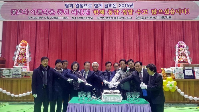 경북 구미시 도량동은 최근 구미고등학교 체육관에서 시·도의원, 전임동장, 주민 등이 참석한 가운데 '2015 도량동민 한마음 송년회'를 개최했다. 사진은 행사에 참석한 관계자들이 떡케이크를 자르는 모습.(사진제공=구미시청)