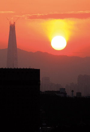 2016년 병신년(丙申年)을 맞은 새해 아침 경제성장의 희망과 통일 염원을 품은 해가 대한민국 초고층 건물인 롯데월드타워 주변에서 떠오르며 하늘을 붉게 물 들이고 있다.