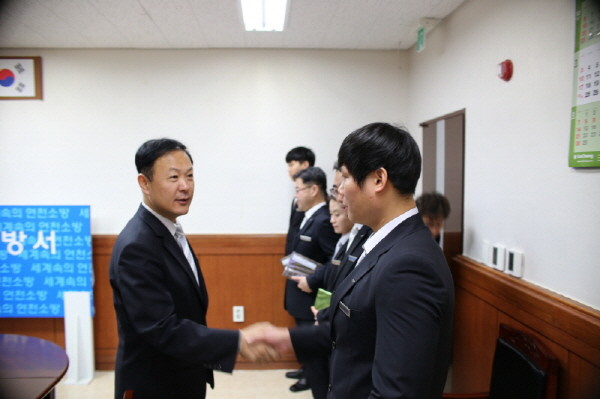 경기 연천소방서는 최근 2015년 소방활동 우수대원들에게 표창 및 상품 수여식을 진행했다. 사진은 수여식에 참석한 이경호 서장이 우수대원들을 격려하는 모습.(사진제공=연천소방서)