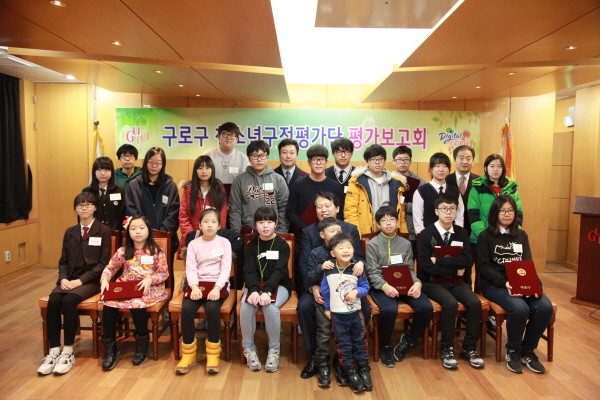 서울 구로구가 최근 구청 창의홀에서 '청소년구정평가단 평가보고회'를 개최했다. 사진은 행사에 참석한 이성 구청장(앞줄 가운데)과 관계자들이 기념촬영을 하는 모습.(사진제공=구로구청)