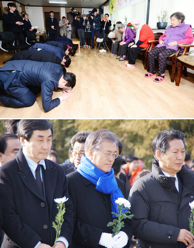 새해 첫날인 1일 오후 경기도 광주시 위안부 할머니들의 쉼터인 나눔의 집에서 새누리당 원유철(왼쪽 세 번째) 원내대표 등 새누리당 의원들이 할머니들께 세배를 하고 있다(위). 더불어민주당 문재인 대표와 당 소속 국회의원들은 1일 경남 김해시 봉하마을 노무현 전 대통령 묘역을 참배했다. 문 대표는 묘역에서 큰절을 올리고, 방명록에 ‘통합의 역사를 만들겠습니다’라고 적었다.