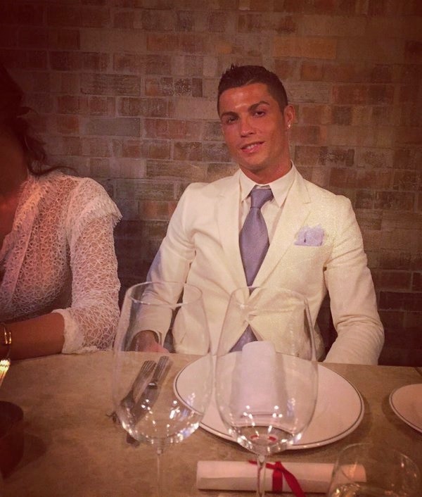 호날두는 연말 모임으로 보이는 곳에서 화이트 수트로 과감한 초이스를 했다. 여기에 그는 라이트 퍼플 컬러의 넥타이와 행커치프로 말끔한 이미지를 선보였다.