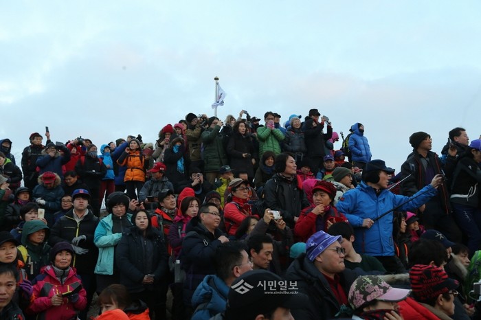 금천구는 지난 1일 오전 7시47분 삼성산 국기봉 정상에서 ‘2016 금천구민 해맞이 행사’를 개최했다. 사진은 해맞이 행사에 참여한 주민들이 떠오르는 해를 보며 사진을 찍는 모습.(사진제공=금천구청)