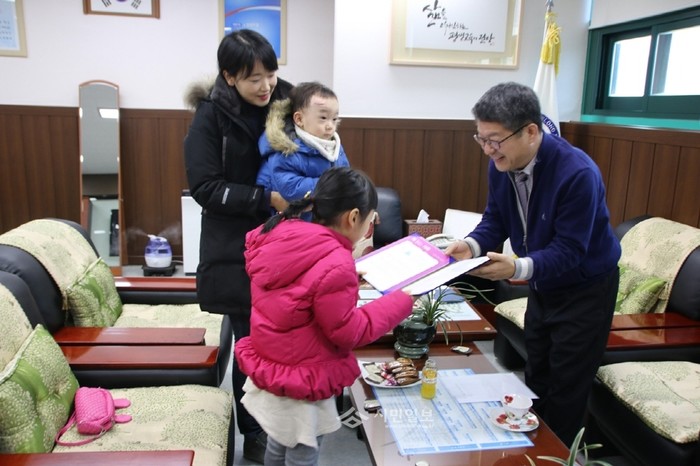 인천평생학습관은 최근 2015년 하반기 ‘책 읽는 가족’으로 홍권표(동춘동)씨 가족을 선정하고 인증서와 현판을 수여했다. 사진은 인증서 수여식이 진행되고 있는 모습.(사진제공=인천시교육청)