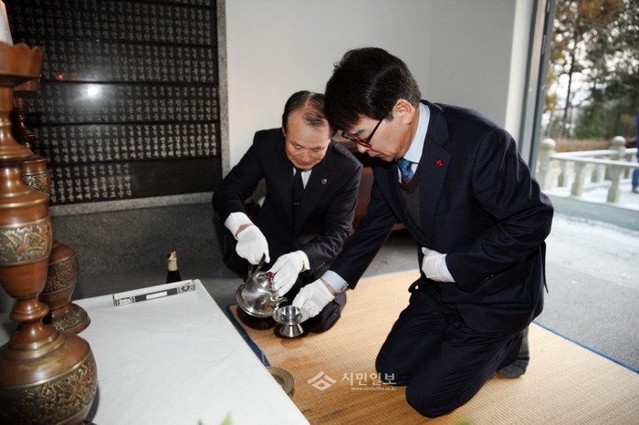 4일 김성 전남 장흥군수는 곽태수 장흥군의회 의장 등 군 관계자들과 함께 예양공원 충혼탑을 찾아 헌화하고 2016년 힘찬 출발을 다짐했다. 사진은 김 군수(오른쪽)가 제주를 올리는 모습.(사진제공=장흥군청)
