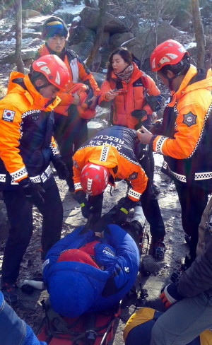 2016년 병신년(丙申年) 첫 날인 지난 1일 오전 광주시 동구에 있는 무등산국립공원을 찾은 해맞이객이 발목을 다쳐 119 산악구조대가 구조작업을 벌이고 있다./뉴시스