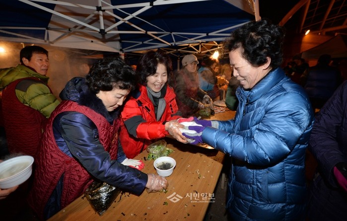서울 동대문구가 최근 배봉산 정상에서 ‘2016년 새해맞이 행사’를 개최한 가운데 산 정상에서 행사에 참여한 주민들이 떡국을 배식받고 있다.(사진제공=동대문구)