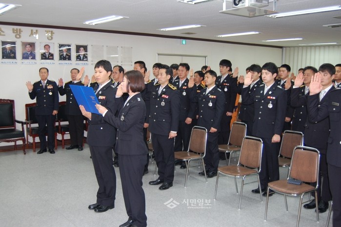 경기 오산소방서는 4일 본서 3층 회의실에서 전직원을 대상으로 '청렴결의대회'를 진행했다. 사진은 행사에 참석한 소방서 관계자들이 선서를 하는 모습.(사진제공=오산소방서)