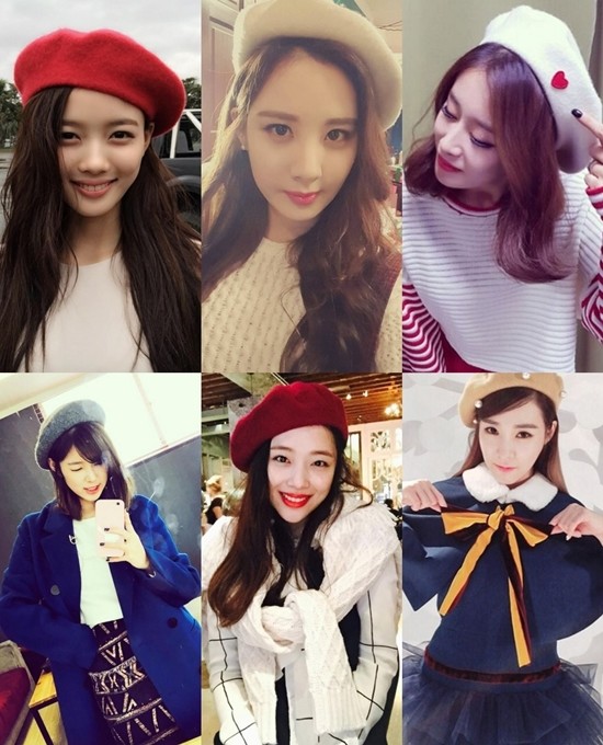 걸그룹 태티서 멤버 티파니와 서현은 베이지 색상의 베레모를 연출했다. 특히 태티서는 최근 발매한 ‘디어 산타(Dear Santa)’에서 베레모를 콘셉트로 해 귀여운 매력을 배가시켰다.