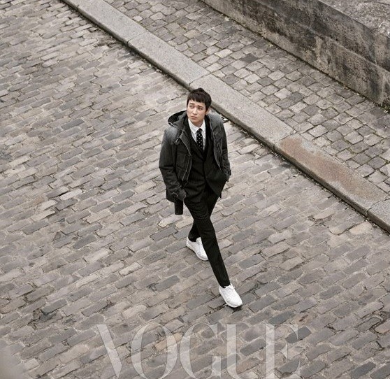 강동원은 지난 2014년 패션지 보그를 통해 공개한 사진에서 깔끔한 수트 패션에 캐주얼한 재킷을 매치 후 길거리를 걸어가는 자연스러운 포즈를 취하고있다.