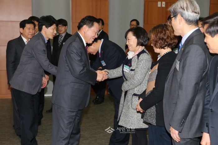 금천구는 지난 4일 오후 2시 구청 12층 대강당에서 '2016년 시무식'을 열고 본격적인 업무를 시작했다. 사진은 차성수 구청장(가운데)이 직원들과 악수하며 새해 인사를 하고 있는 모습.(사진제공=금천구청)