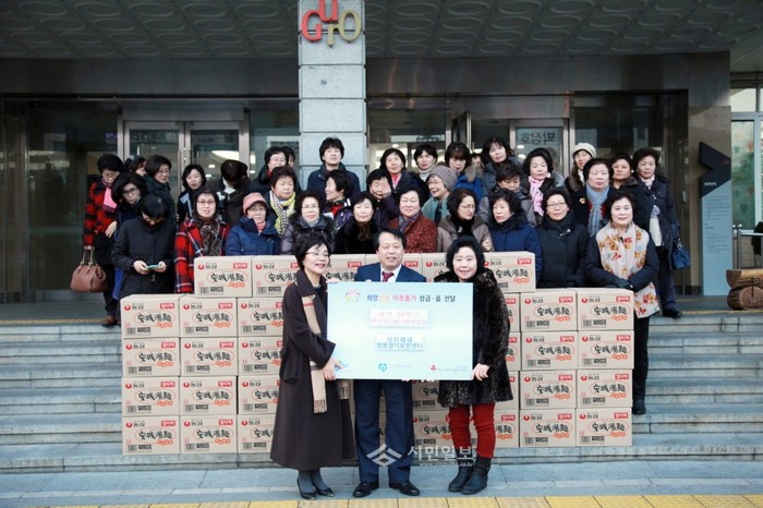 최근 서울 구로구 가리봉동에 소재한 아이레네 방문장기요양센터가 어려운 이웃들의 겨울나기를 돕기 위해 라면 50상자를 구로희망푸드마켓에 기증했다. 사진은 이성 구청장(가운데)과 관계자들이 기념촬영을 하는 모습.(사진제공=구로구청)