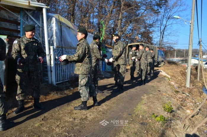 최근 경기 양주시 광적면 효촌리에 위치한 육군 제1공병여단 개척대대는 최근 추위에 취약한 저소득 5가구에 연탄 1000장(1가구당 200장)을 전달했다. 사진은 봉사활동에 참가한 군인들이 연탄을 나르는 모습.(사진제공=양주시청)