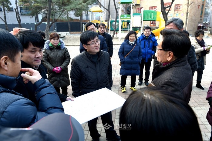 김성환 노원구청장(가운데)이 지난 6일 오후 3시50분 주거환경관리사업 대상지인 공릉동해오라기 어린이 공원을 방문해 주민협의회 대표의 민원 내용을 경청하고 있다.(사진제공=노원구청)