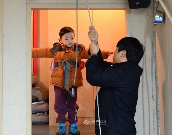 지난 6일 영등포소방서는 소방안전체험관에서 양평동교회 어린이집 보육교사와 원아들을 대상으로 '소방안전체험교육'을 실시했다. 사진은 한 어린이가 안전한 대피를 위한 완강기 탈출체험을 하는 모습.(사진제공=영등포소방서)