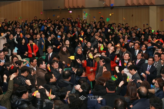 서울 서초구는 지난 4일 서초구민회관 대강당에서 직원 800여명이 참석한 가운데 '2016 무한도전으로 펼치는 나비의 꿈'이라는 주제로 시무식을 개최했다. 사진은 직원들이 새해 덕담을 적은 종이비행기를 날리는 모습.(사진제공=서초구청)